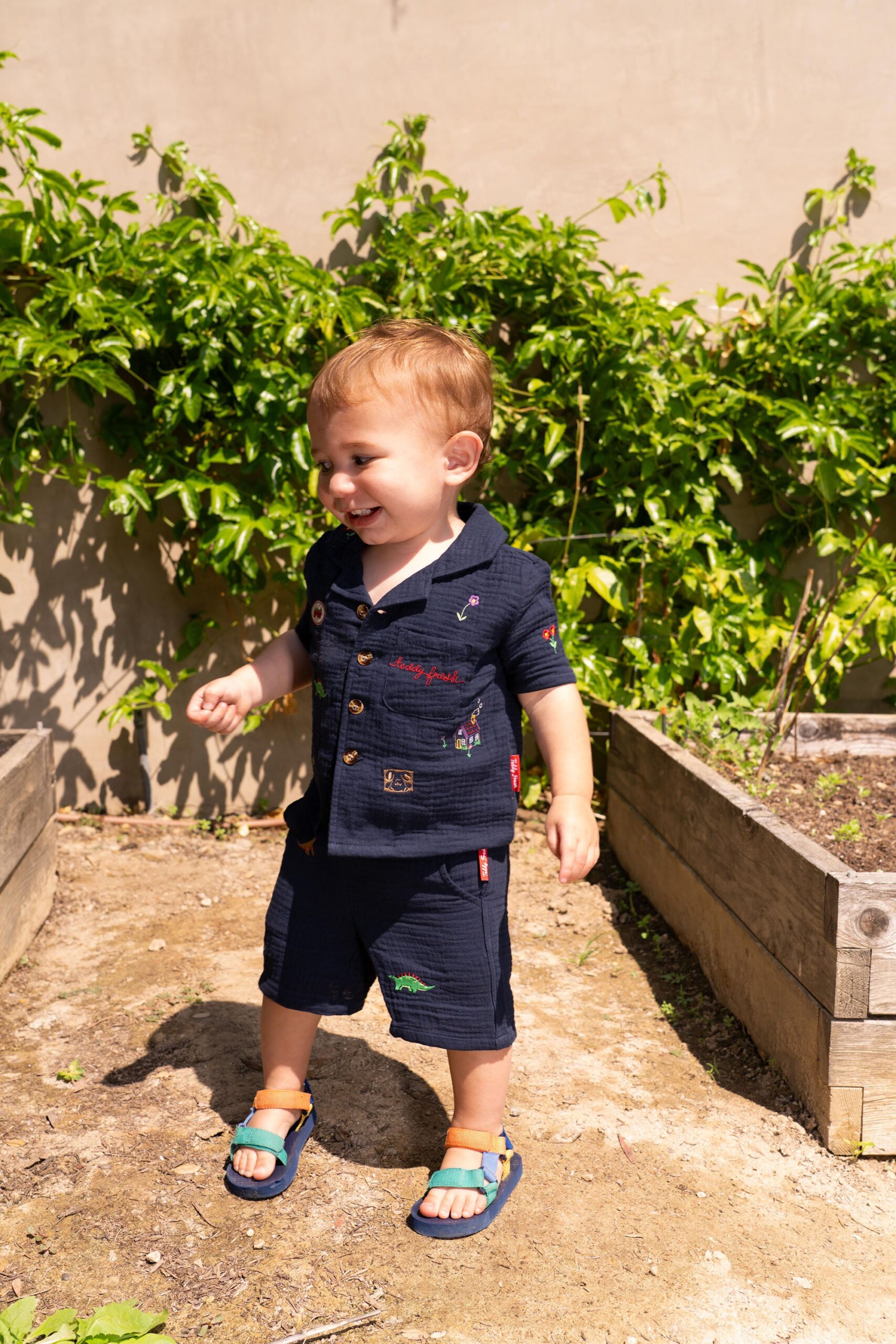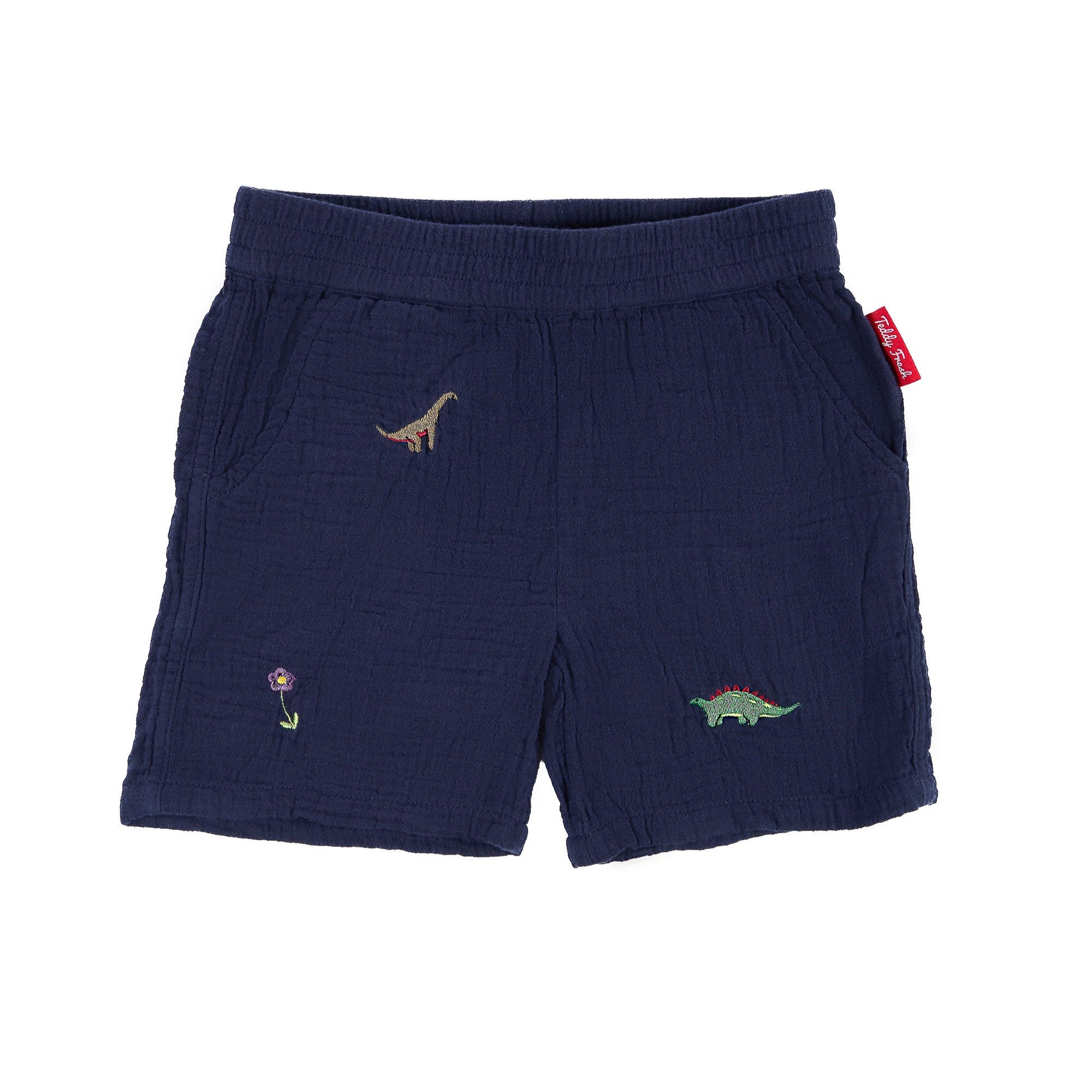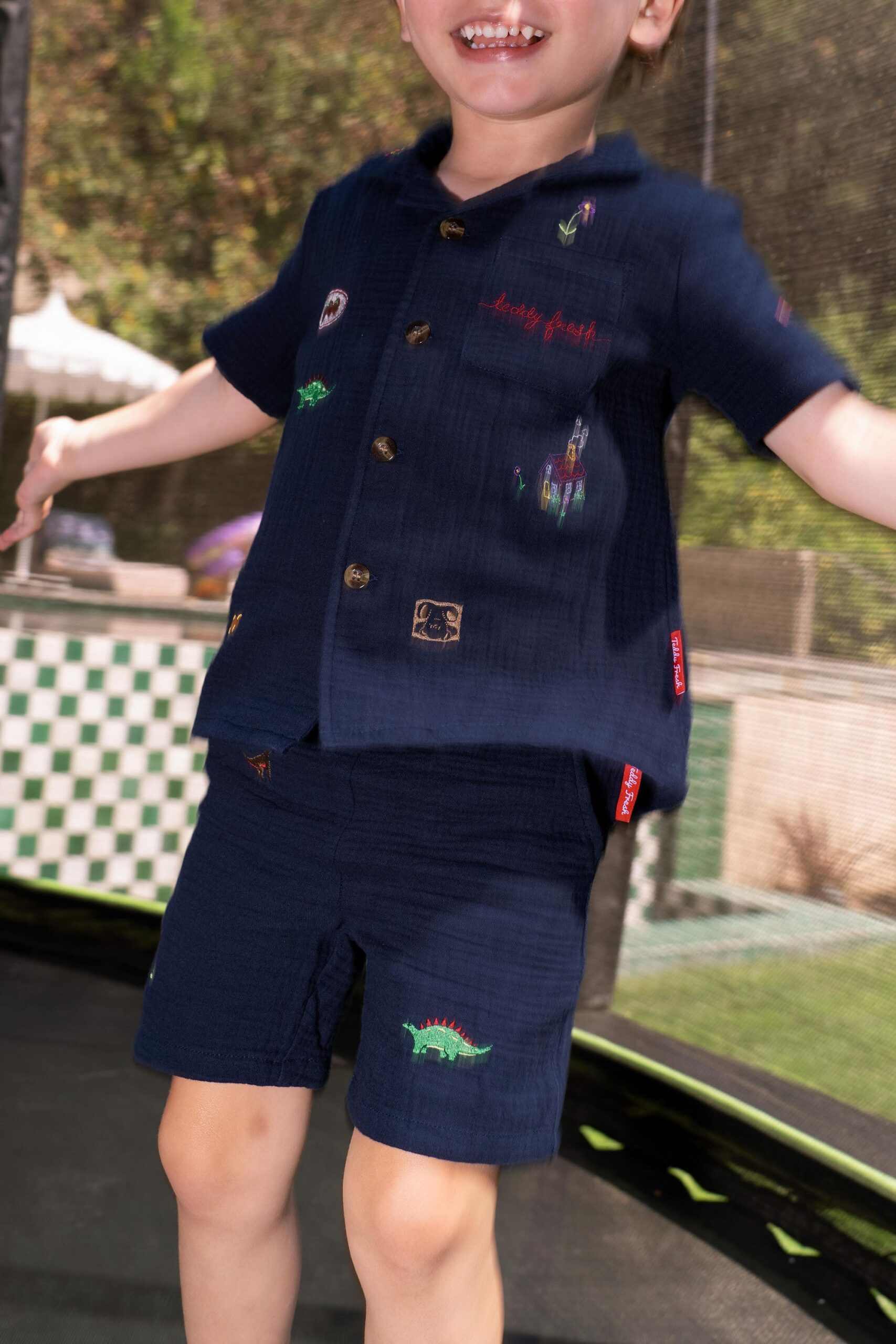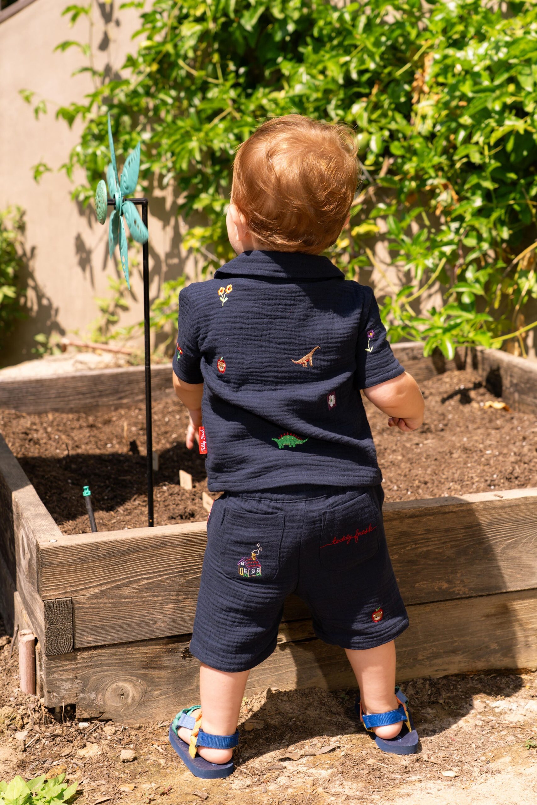 DETAILS Kid’s woven shorts Direct embroidery satin stitch motifs allover Encased elastic waistband Red TF woven label on wearer’s left hip Front slant pockets Left rear patch pocket with direct embroidery artwork Right rear patch pocket with TF embroidery 100% Cotton, 120gsm FIT Kid’s Regular Fit Size 4/5: Waist (relaxed): 21″ Waist (extended): 27″ Hip: 25″ Inseam: 3.5″ Sunny is 16 months old and wearing size 2/3 Bruce is 3 years old and wearing size 3/4 Teddy is 6 years old and wearing size 4/5