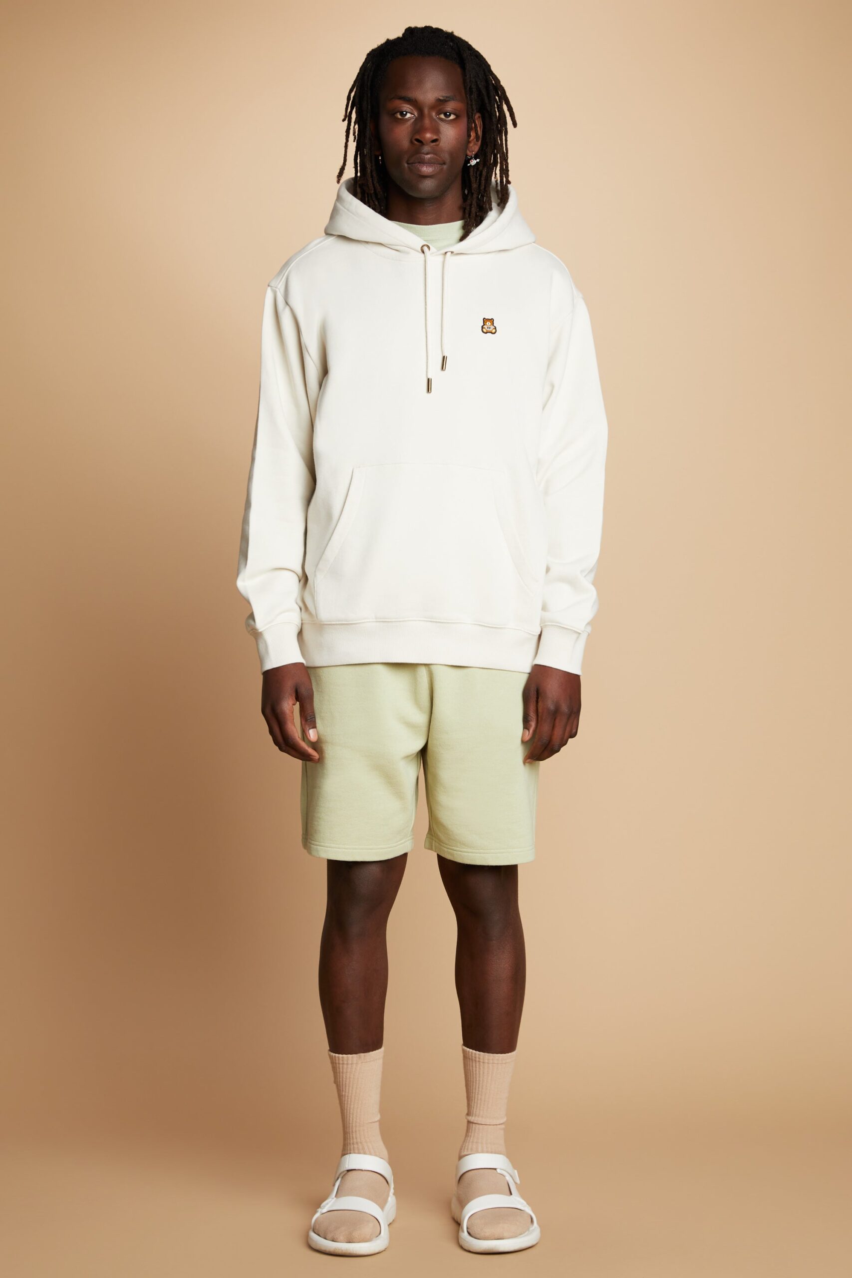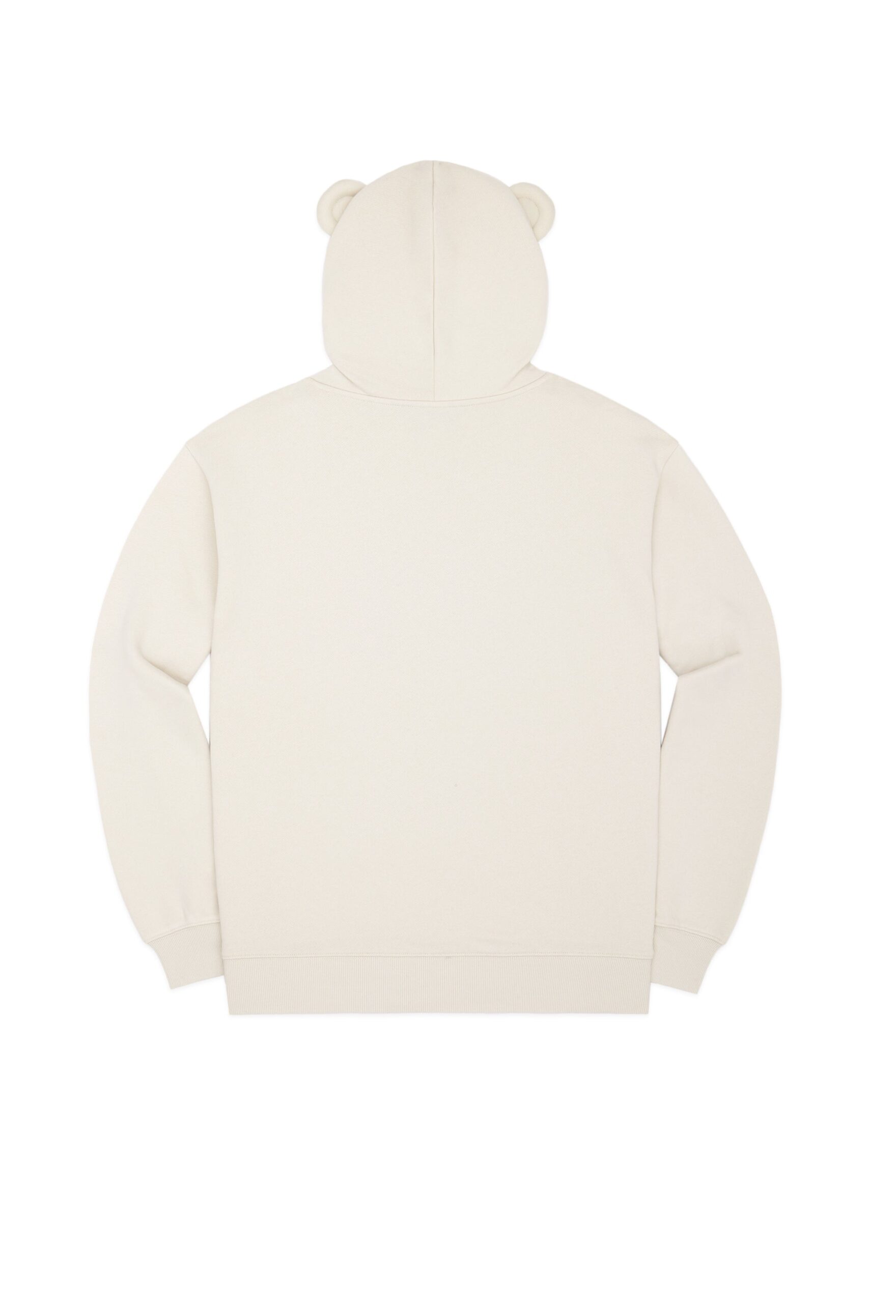 DETAILS Fleece hoodie with bear ears Braided drawcord hood with with debossed metal aglets Embroidered bear patch on chest Ribbed cuffs, neckband, and waistband Kangaroo pocket 100% Pre-shrunk cotton fleece, 320gsm, fabric piece dyed FIT Unisex regular fit Size Medium: Chest: 48″ Length: 27″ (measured flat) Malcolm is 6’1″ and wearing size L Model’s chest/bust: 36″ Model’s waist: 32″ Horace is 6’0″ and wearing size M Model’s chest/bust: 40″ Model’s waist: 31″ Model’s hip: 30″