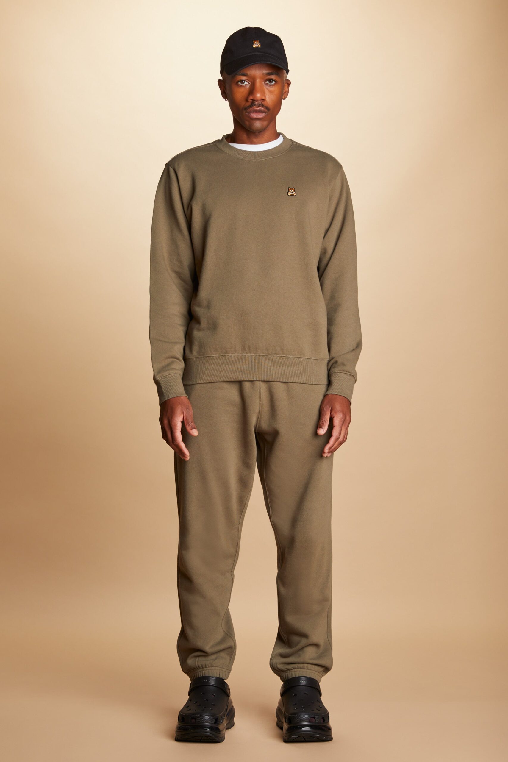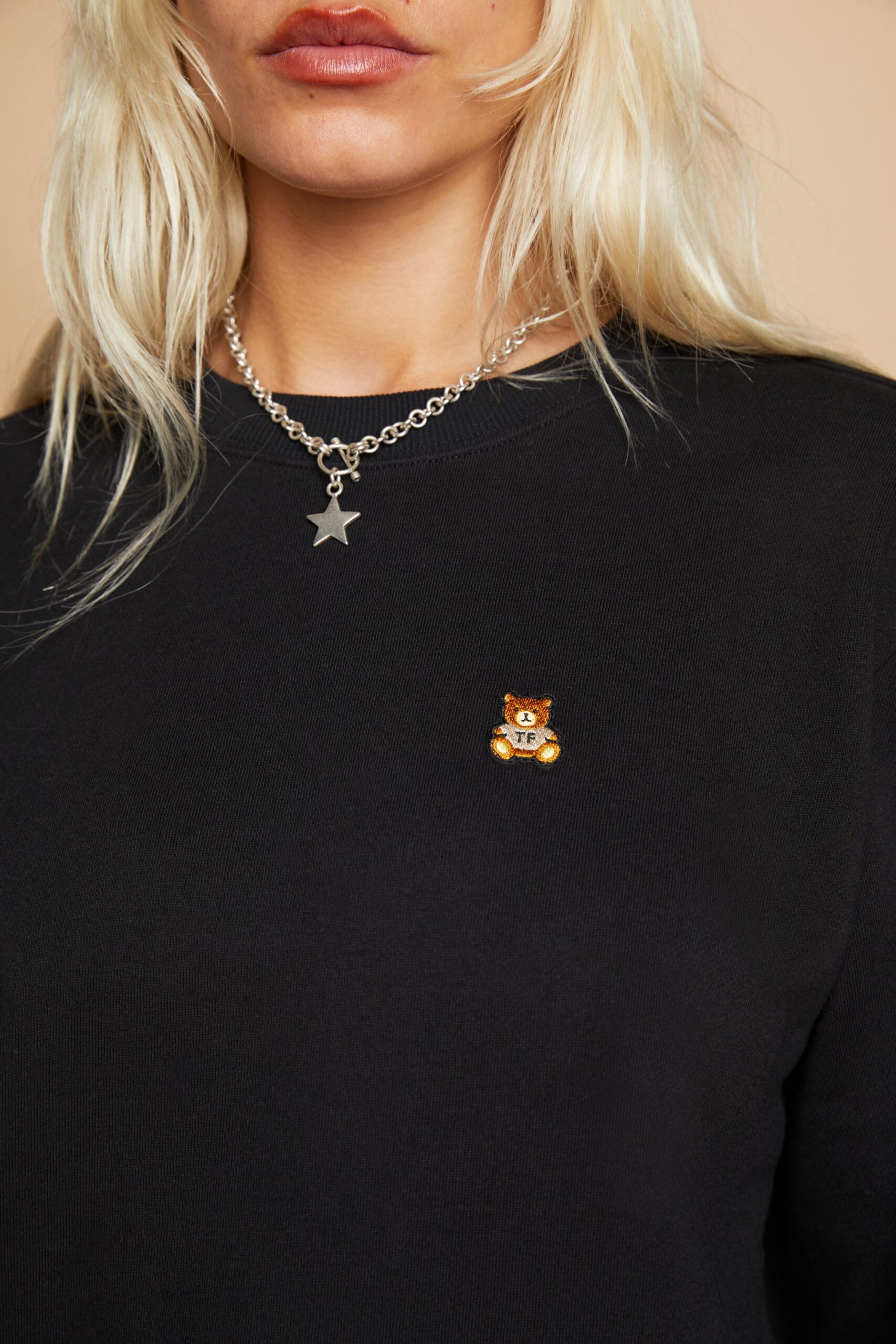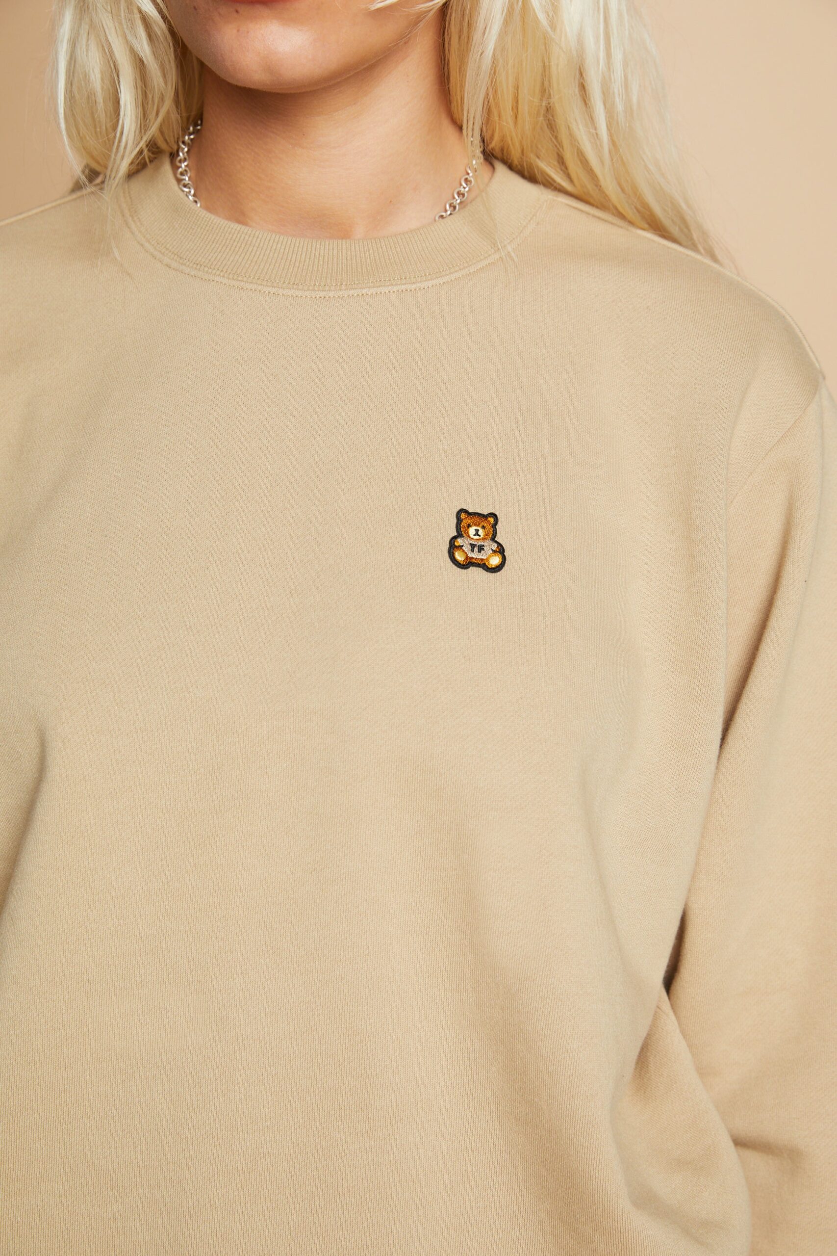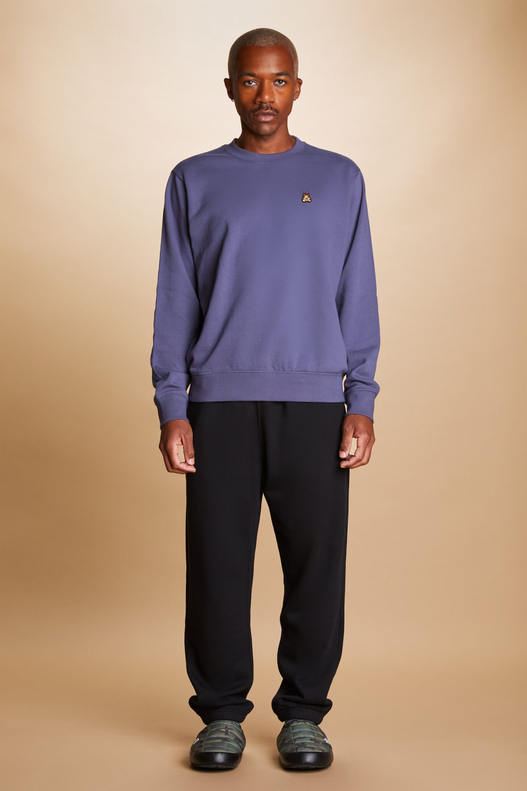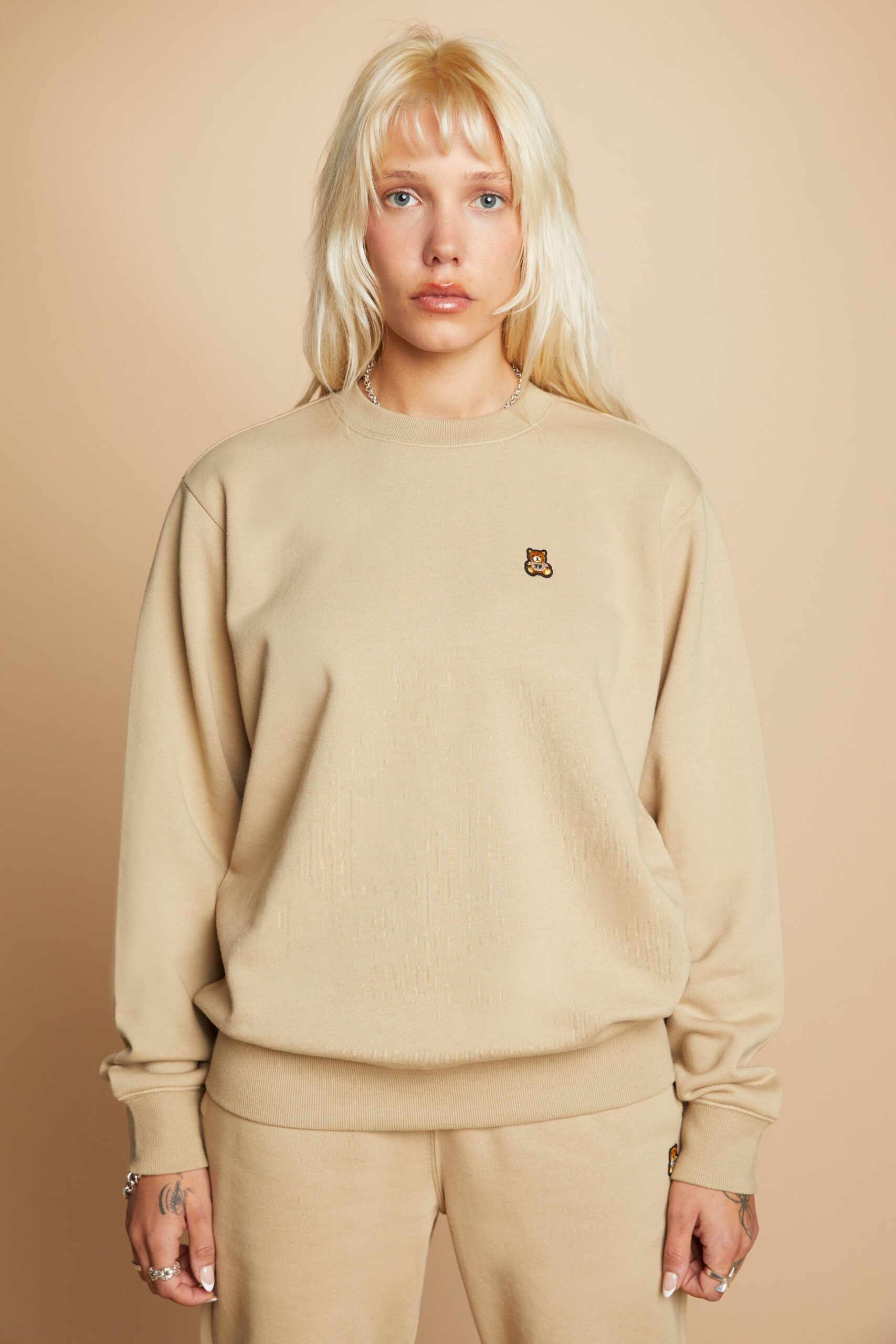 DETAILS Fleece crewneck Embroidered bear patch on chest Ribbed cuffs, neckband, and waistband 100% Pre-shrunk cotton fleece, 320gsm, fabric piece dyed FIT Unisex regular fit Size Medium: Chest: 49″ Length: 27.5″ (measured flat) Malcolm is 6’1″ and wearing size M and L Model’s chest/bust: 36″ Model’s waist: 32″ Sabrina is 5’7″ and wearing size S Model’s chest/bust: 34″ Model’s waist: 27″ Horace is 6’0″ and wearing size M Model’s chest/bust: 40″ Model’s waist: 31″ Model’s hip: 30″