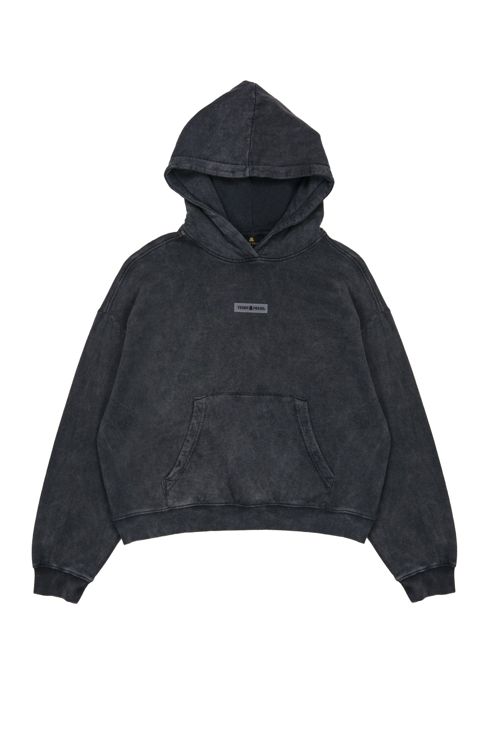 DETAILS Pigment dyed garment washed pullover fleece hoodie Embossed TF silicone label on chest Ribbed cuffs and waistband Kangaroo pocket This garment has undergone a special dye process and is subject to natural variations. No two pieces are alike. 100% Cotton, 320gsm FIT Unisex Boxy Fit Size Medium: Chest: 50″ Length: 25.5″ Sleeve: 23″ Bailey is 5’5″ and wearing size S Model’s chest/bust: 32″ Model’s waist: 25″ Model’s hip: 31″ Maddie is 5’10” and wearing size XL Model’s chest/bust: 42″ Model’s waist: 38″ Model’s hip: 44″ Jawn is 6’0″ and wearing size M Model’s chest/bust: 36″ Model’s waist: 32″ Model’s hip: 40″ CARE Our pigment-dyed garments are designed to have a lived-in, vintage look that may continue to fade slightly over time with washing. This is part of their unique character. To help maintain the look and quality of your pigment-dyed garments, we suggest the following care instructions: Turn the garment inside out before washing. Use cold water and a gentle cycle. Wash separately or with like colors, especially for the first few washes. Do not pour detergent directly onto the garment. Instead, dilute detergent in water first or add it to the washing machine drum before adding garments to the cycle. Use a mild detergent. Avoid bleach or harsh chemicals. Lay flat to dry to prevent shrinking and fading.