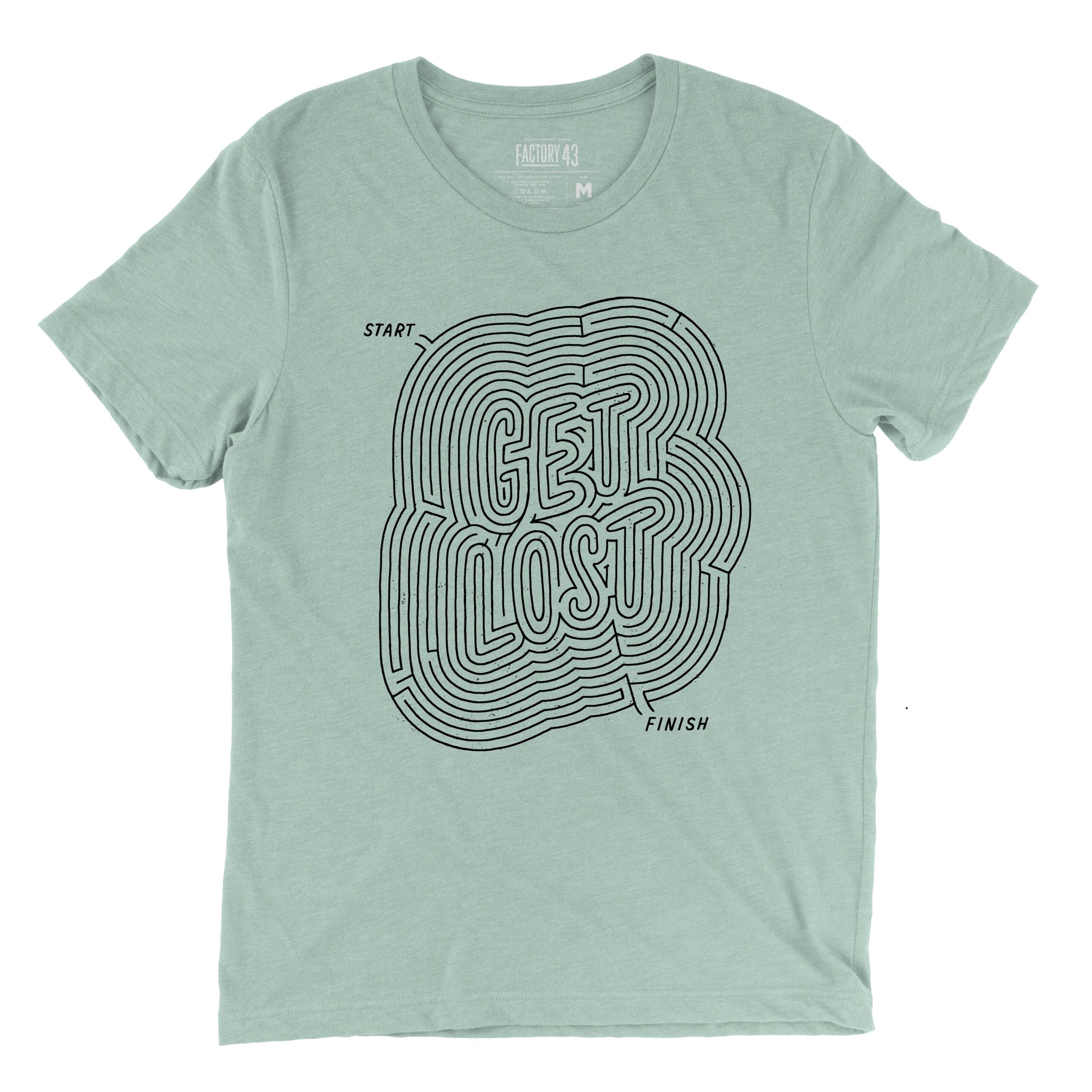 Soft cotton-poly tee in Heather Mustard, Dust, or Dusty Blue. Discharge print 52% combed and ring-spun cotton, 48% polyester blend