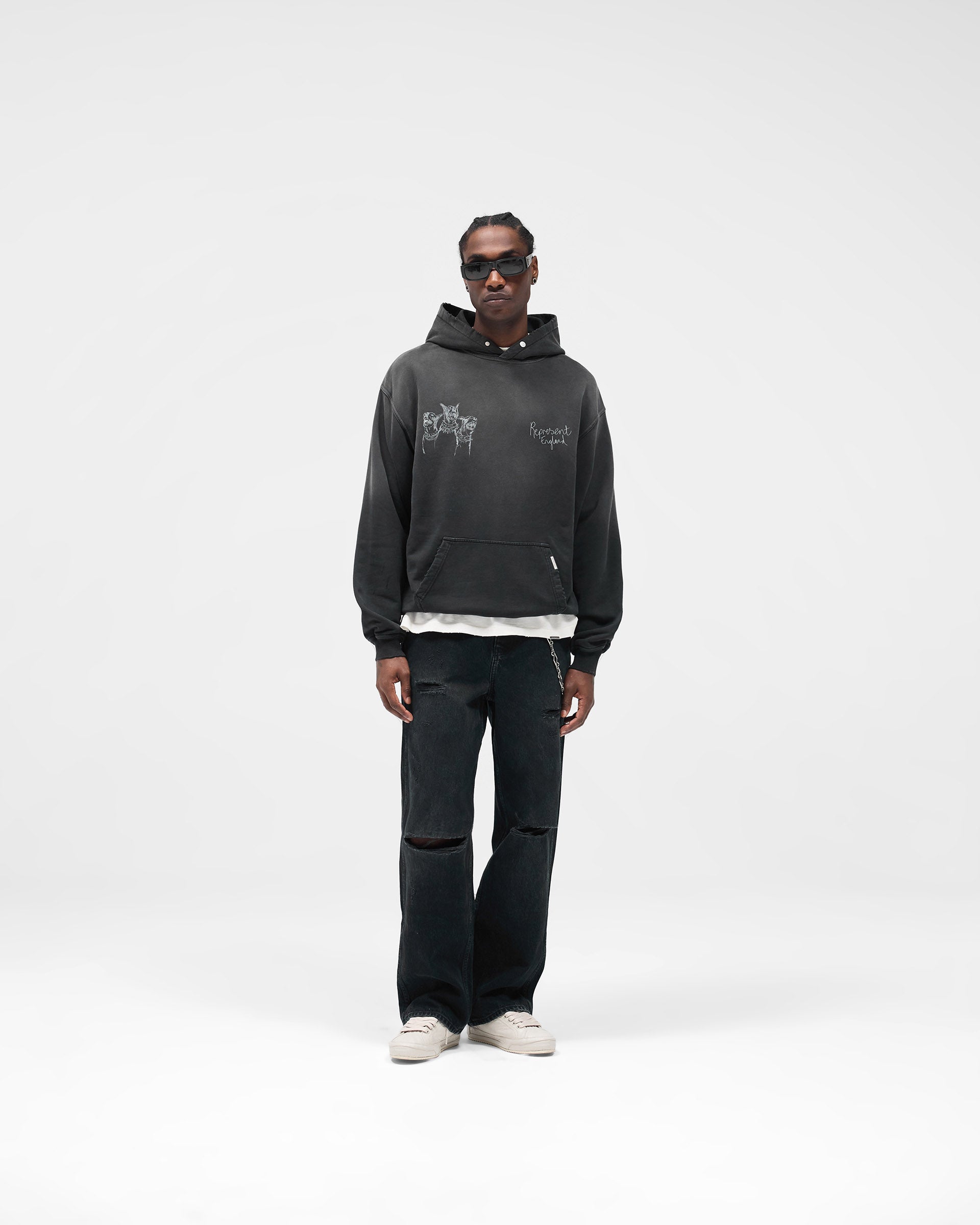 Introducing the Hand Drawn Thoroughbred Hoodie in Aged Black, crafted from heavyweight 486GSM cotton with an oversized fit. The hoodie features a hand-drawn Thoroughbred graphic across the chest and back, paired with Represent England script. Designed with ribbed hem and cuffs, the piece is subtly distressed for a lived-in feel and finished with our signature metal bar on the pocket. Aged Black Thoroughbred Hoodie Oversized Fit 486GSM Heavyweight Cotton Hand Drawn Thoroughbred Graphic Front & Back Rib Hem and Cuffs Subtle Distressing Represent England Script Branding Signature Represent Metal Bar on Pocket Composition: 100% Cotton486GSM Model Measurements: Model is 184.5cm and 72kg wearing size M