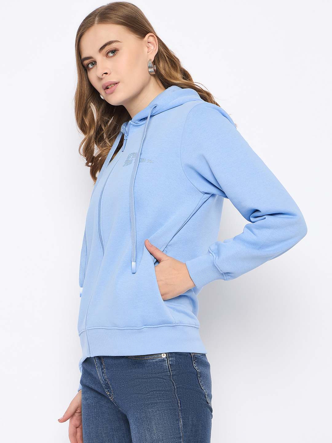 Madame Fleece Placement Printed Zipped Powder Blue Hooded Sweatshirt