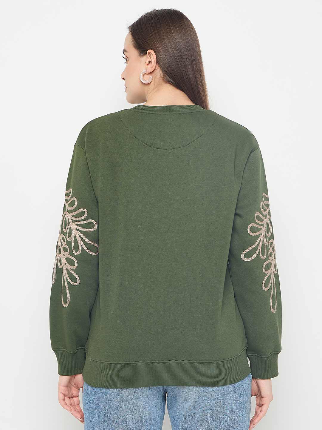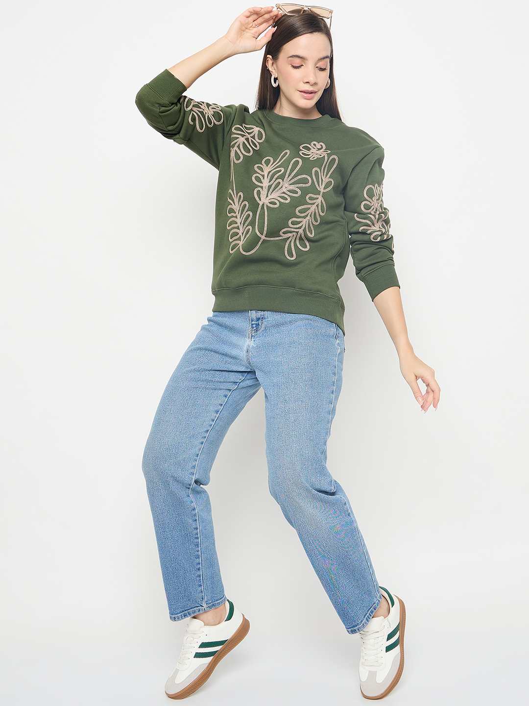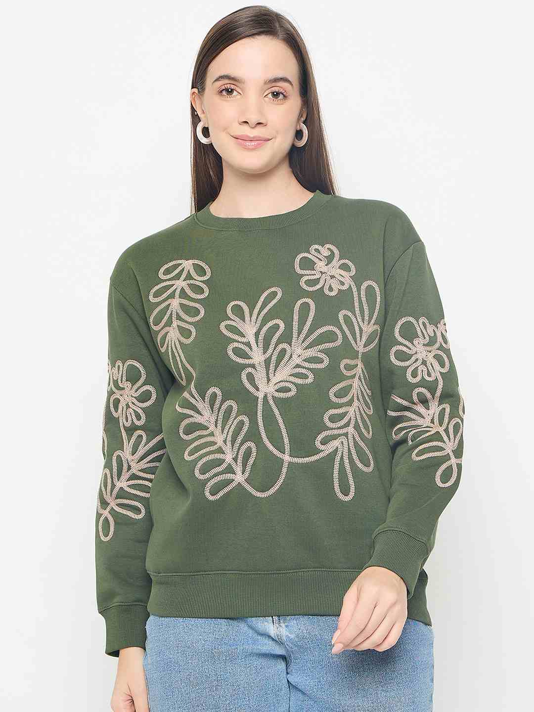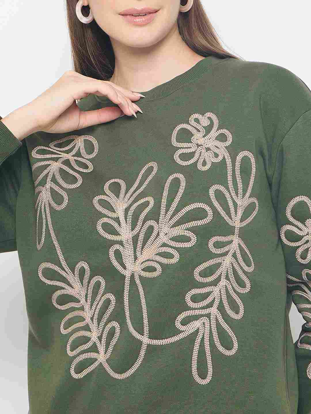 Madame Floral Embroidery Cotton Blend Green Sweatshirt