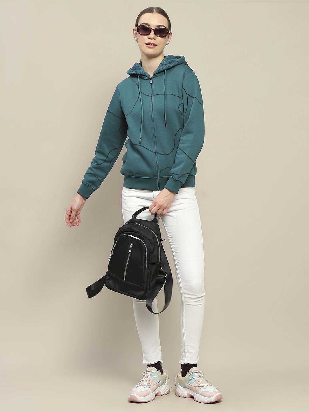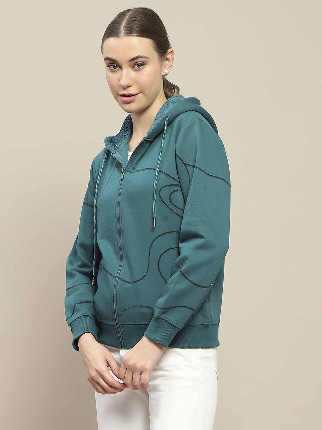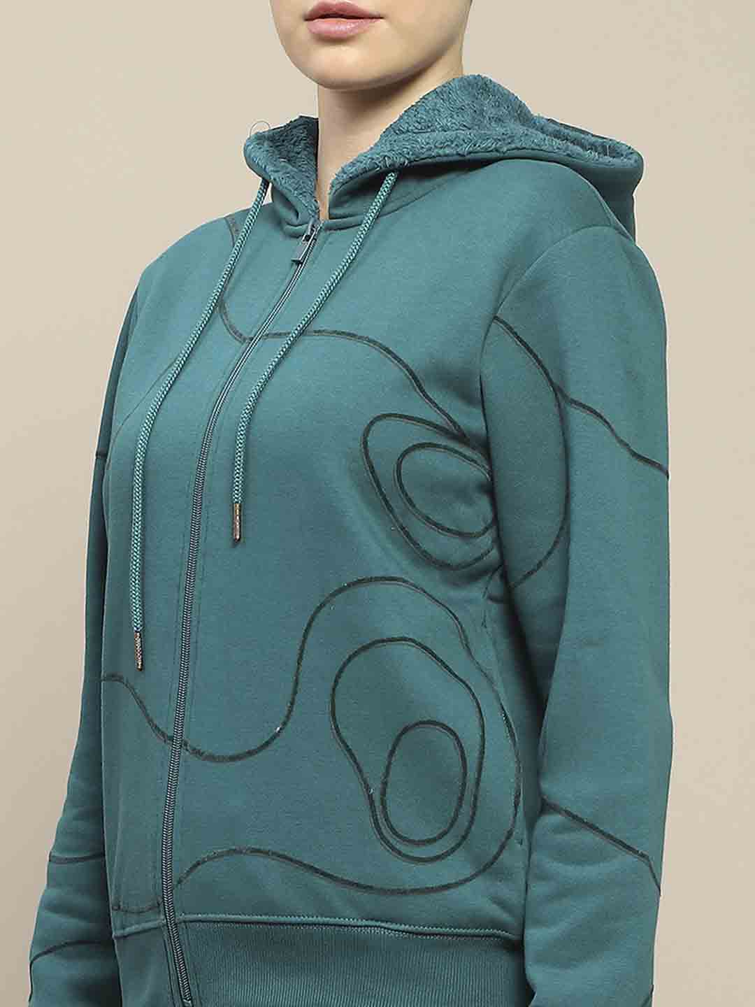Madame Geometric Print Zipped Teal Hooded Sweatshirt