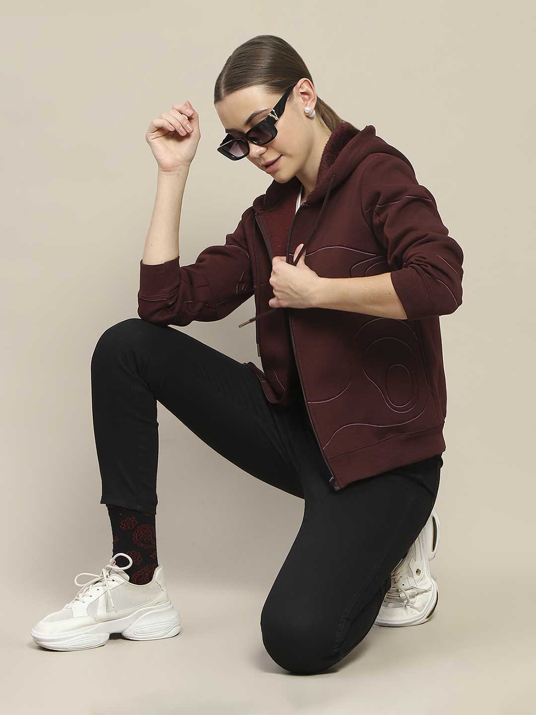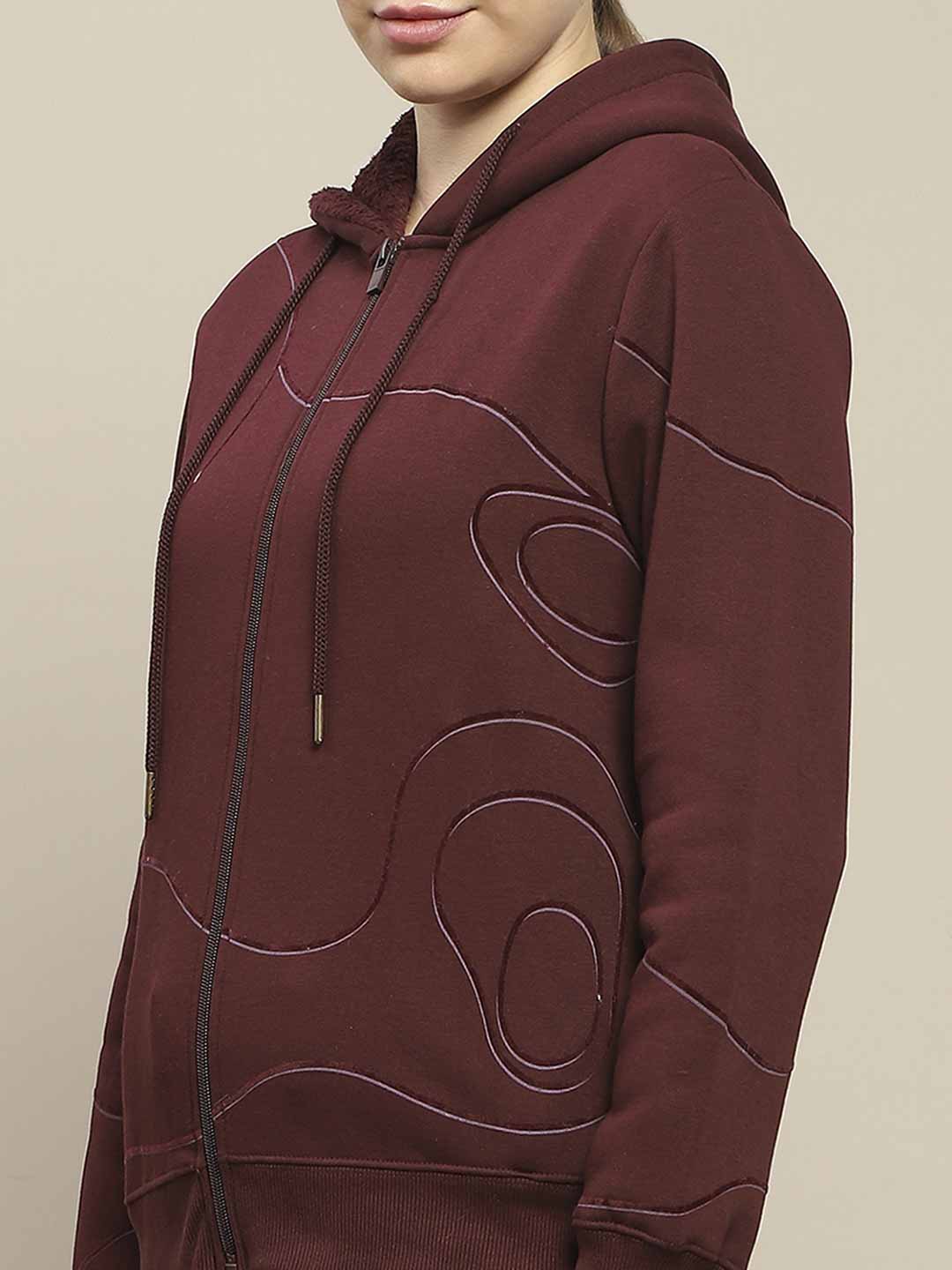 Madame Geometric Print Zipped Wine Hooded Sweatshirt