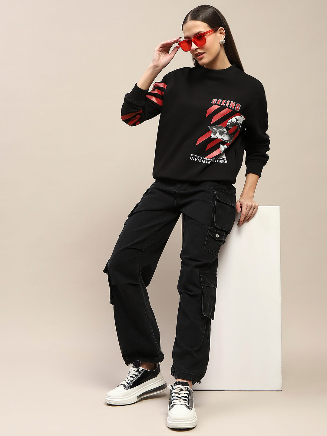 The striking graphic print on the front adds a trendy touch, ensuring you stand out while keeping it effortlessly cool. Whether you’re lounging at home, running errands, or meeting friends for coffee, this sweatshirt is versatile enough to pair with your favorite jeans, leggings, or even a stylish skirt for a more polished look. The ribbed cuffs and hem provide a snug fit, helping to keep the warmth in. Available in a timeless black color, it serves as a blank canvas for the eye-catching graphic.