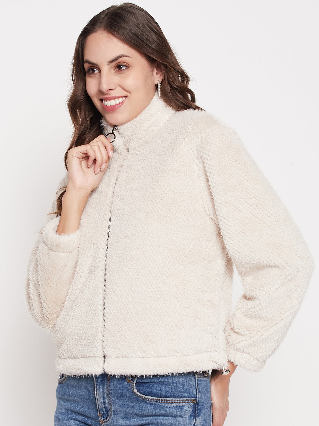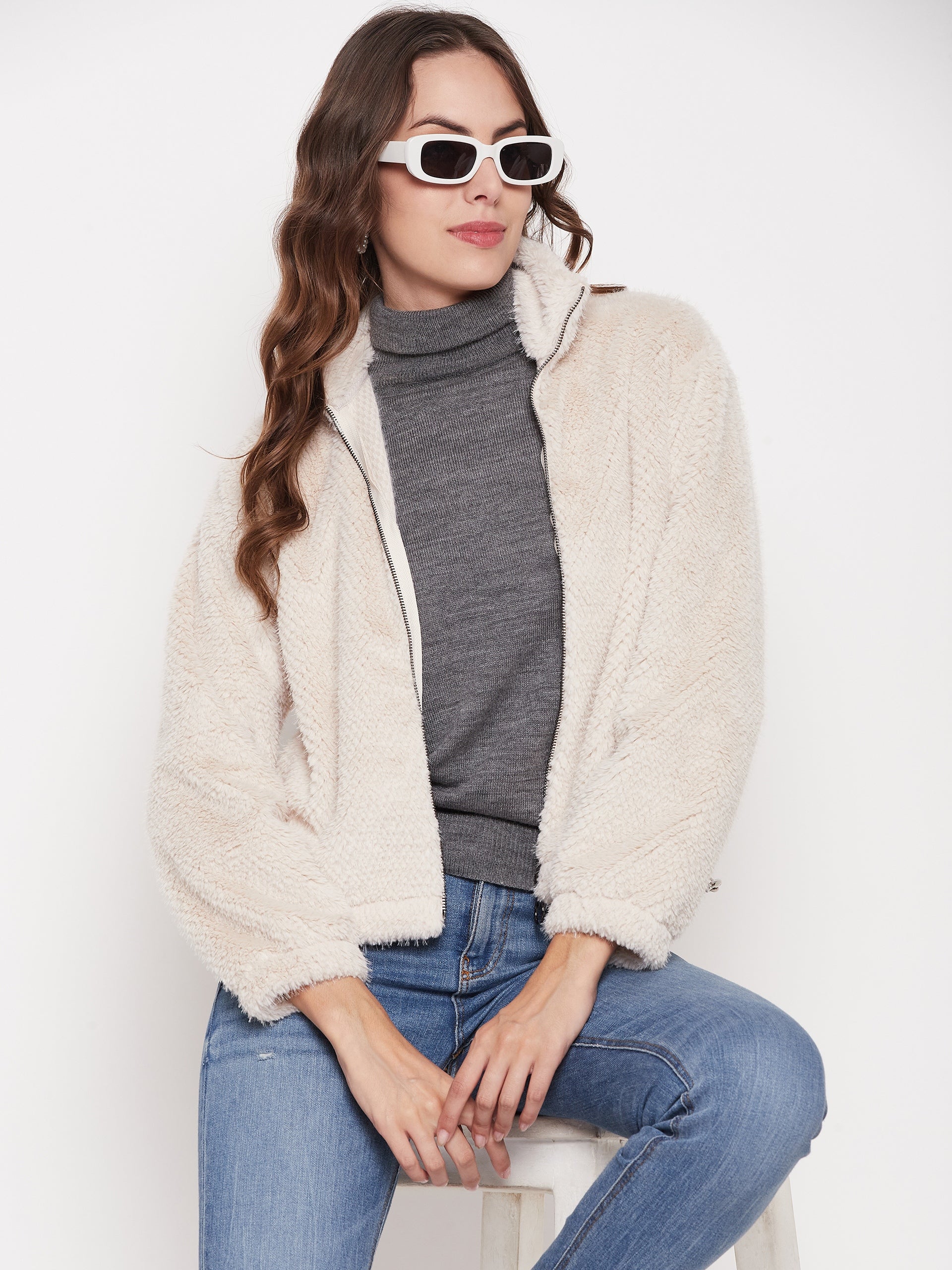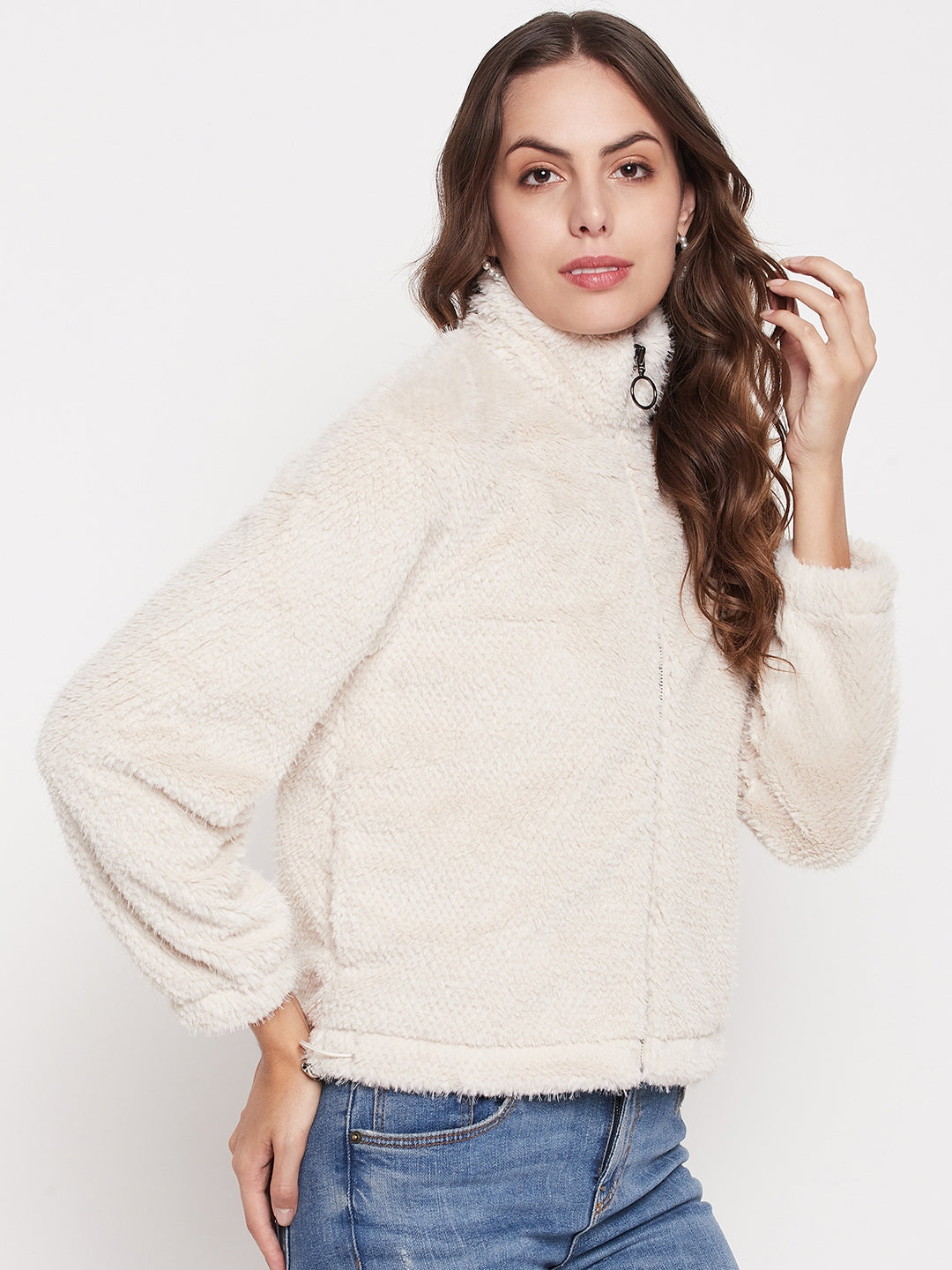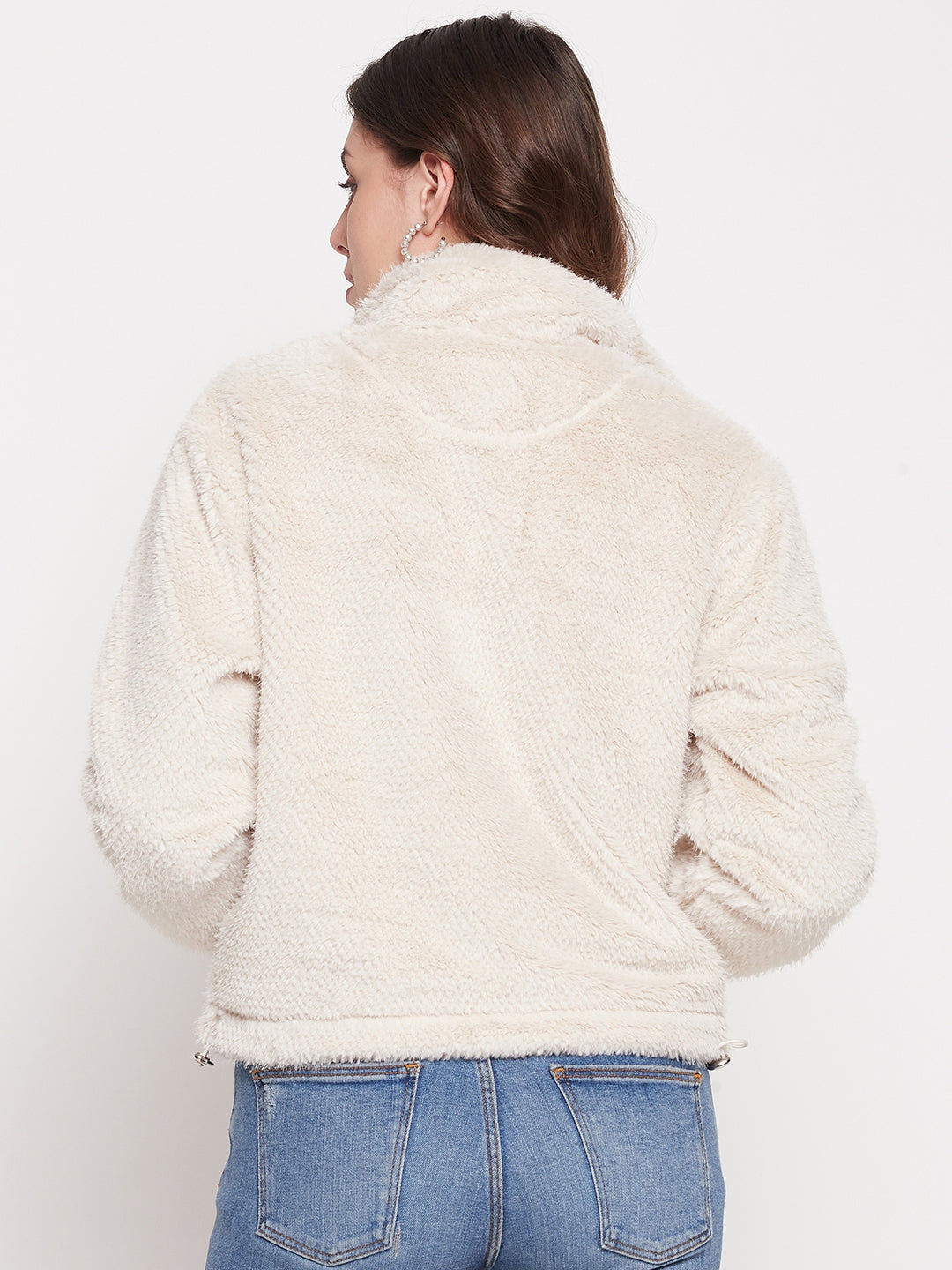 Madame Off-White Fluffy-knit Sweatshirt, a pleasant and fashionable addition to your collection. This sweatshirt is designed to keep you comfortable and on-trend whether worn for a casual outing or resting at home. The zip detail adds ease as well as a bit of modern flair. This sweatshirt is made of soft fabric and has a mock neck and a standard fit for a versatile and comfy style.