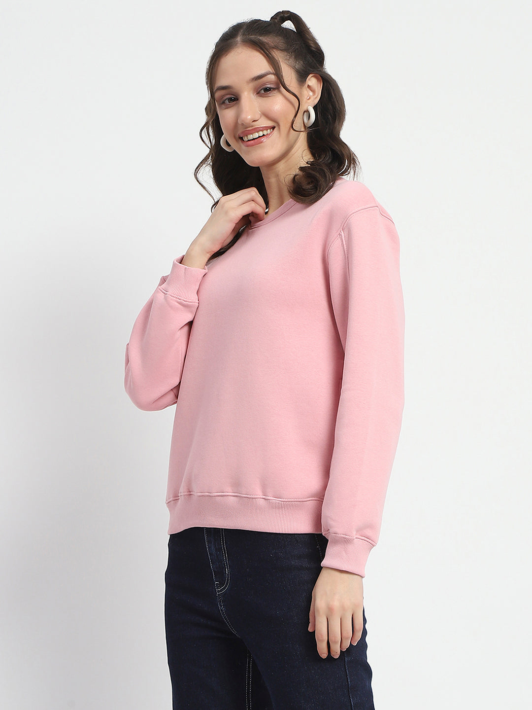 Madame Solid Light Pink Crew Neck Cotton Sweatshirt