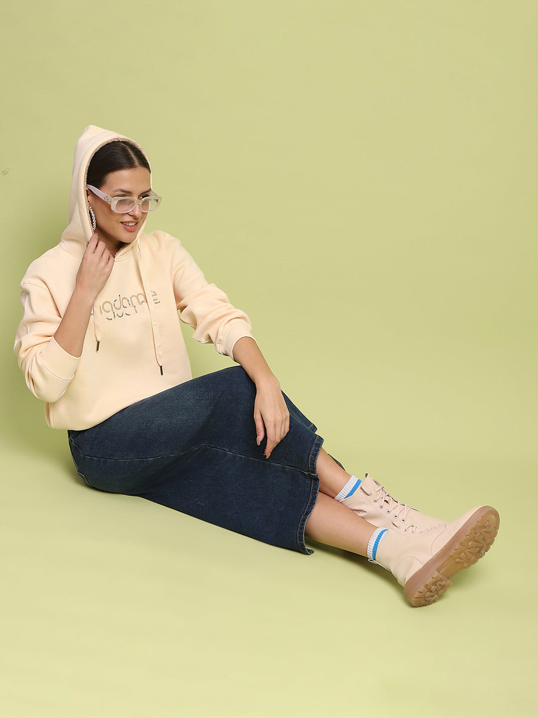 Madame Typography Print Hooded Beige Cotton Sweatshirt
