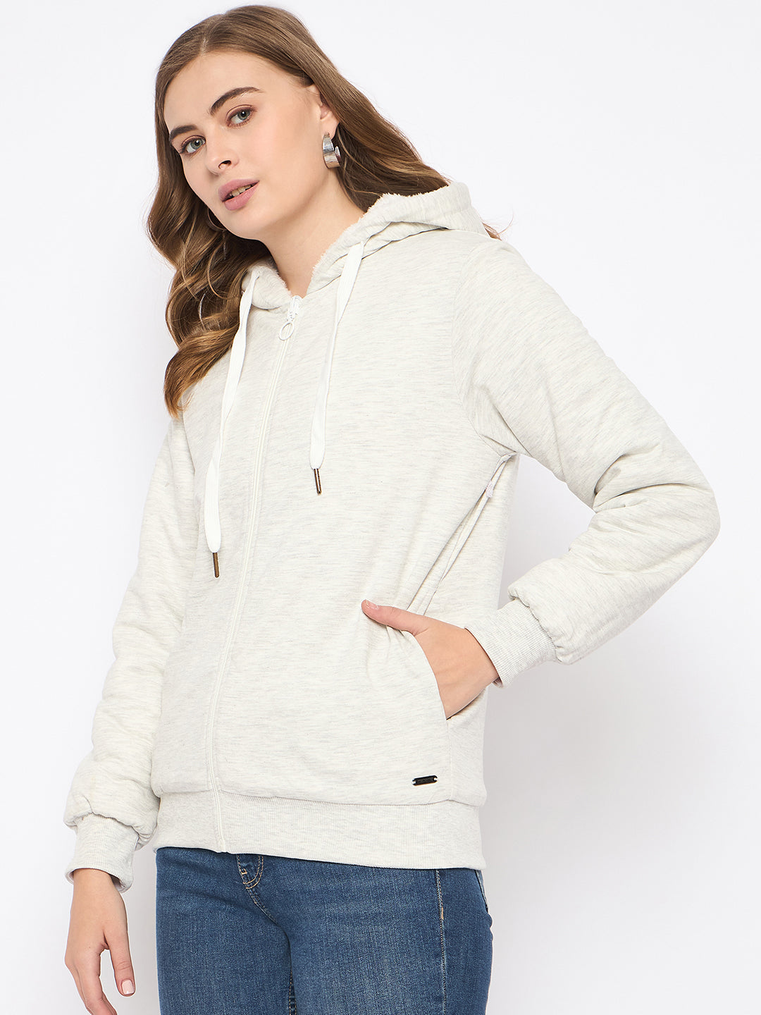 Crafted from a soft, breathable cotton-blend fabric, this hoodie offers a cozy, lightweight fit ideal for year-round wear. The standout feature is the intricate metal zipper detailing along the front, adding a touch of bold sophistication to the classic white design. With a flattering silhouette, adjustable drawstring hood, and kangaroo pockets for added convenience, this sweatshirt effortlessly transitions from casual daywear to a cool evening look.