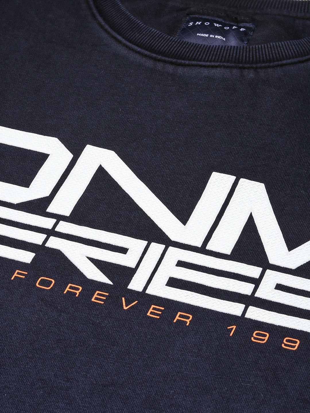 Men’s Navy Blue Typography Printed Cotton Slim Fit Pullover