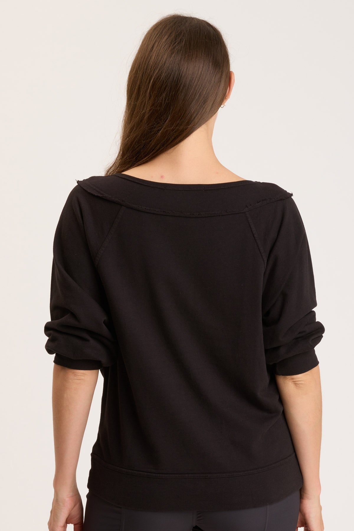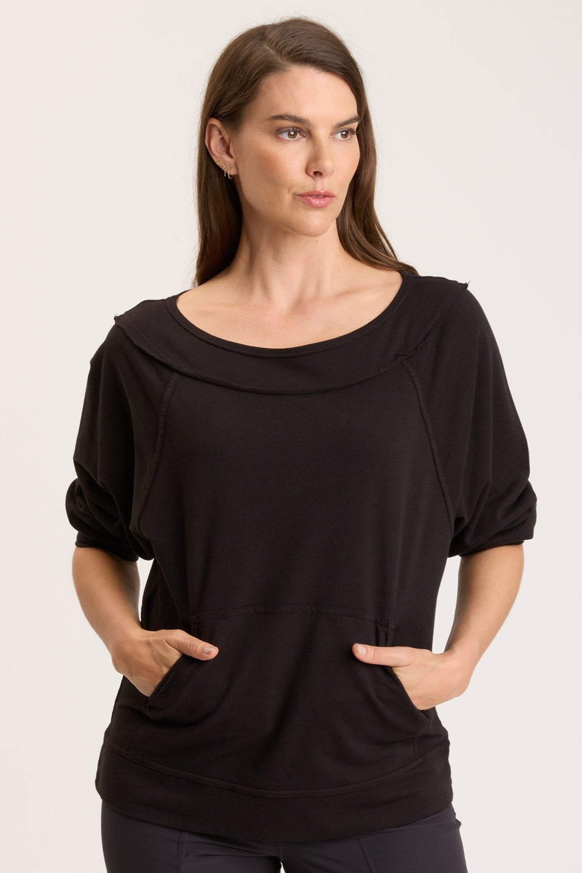Boat neck, kangaroo pocket, raglan sleeves and raw edges help to pull Orville in front of the pack! Grab up this cozy one ASAP! Splendid Terry: 60/40 Cotton/Rayon. Center Front: ~22.5″ Center Back: ~24.25″ Color Description: A classic midnight black Preshrunk Machine washable Imported MODEL Veronica is wearing size Small Height: 5’10” | Bust: 34B | Waist: 28″ | Hip: 37″