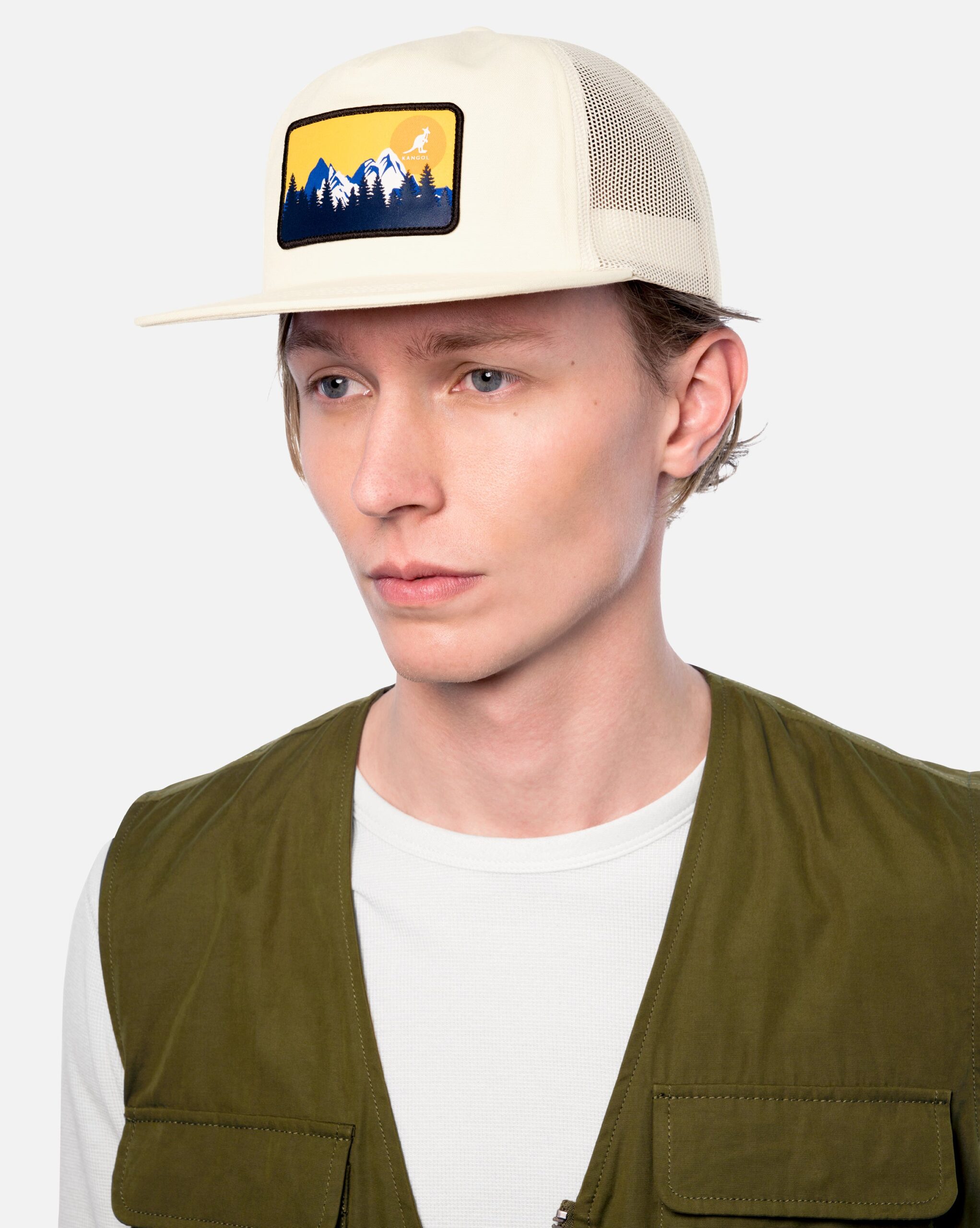 The Outdoor Patch Trucker by Kangol is an organic cotton canvas and recycled polyester mesh trucker cap. It has all the stylings of a traditional trucker, but using higher quality materials that are earth minded. The custom outdoor inspired patch utilizes heavy stitching, heat transfer and water-based printing techniques for a dimensional graphic. A tonal snapback adjuster assures a great fit, and a Kangol® Kangaroo logo loop label is stitched at the back left opening. Snap Back Closure