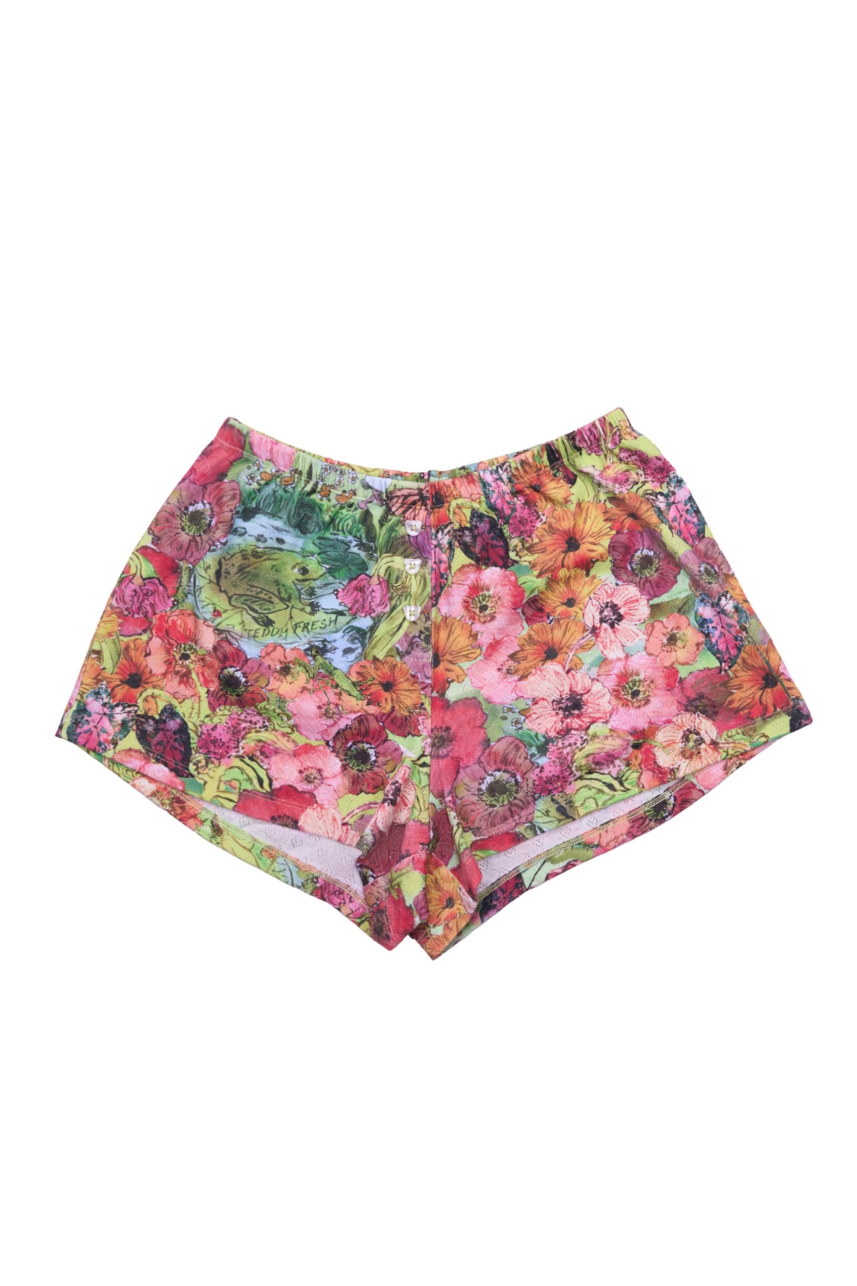 DETAILS Pointelle shorts featuring original artwork by Emma Louthan Allover digital print artwork Encased elastic waistband Non-functional fly with pearlized ted head buttons 100% Cotton, 245gsm FIT Women’s regular fit Size Medium: Waist (relaxed): 27″ Waist (extended): 41″ Hip: 42.5″ Inseam: 3″ Mikela is 5’6″ and wearing size M Model’s chest/bust: 35″ Model’s waist: 26″ Model’s hip: 38″ Jillian is 5’6″ and wearing size S Model’s chest/bust: 35″ Model’s waist: 25″ Model’s hip: 37″