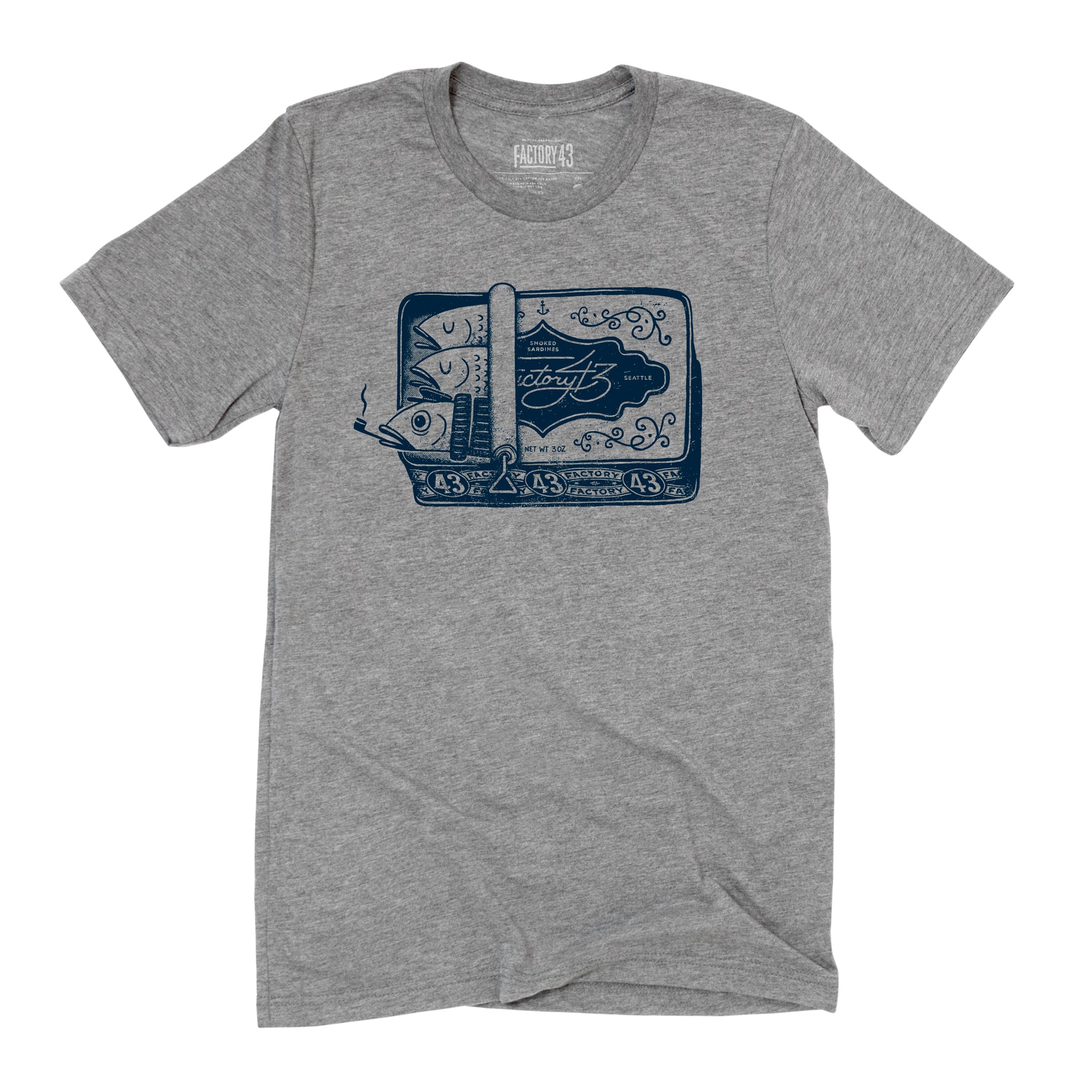 Super-soft triblend tee in Dusty Blue and Gray. Water-based inks 3.8 oz., 50% polyester, 25% combed and ringspun cotton, 25% rayon blend