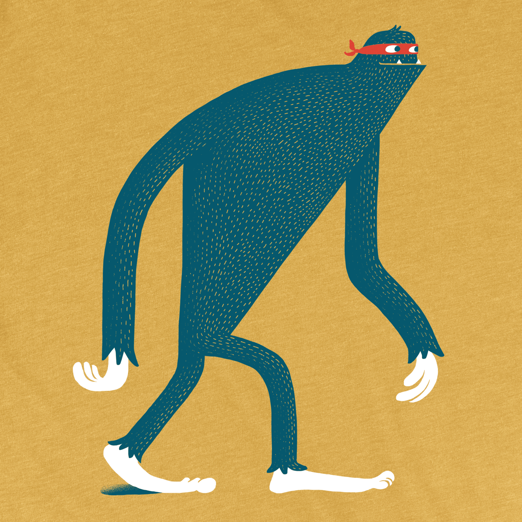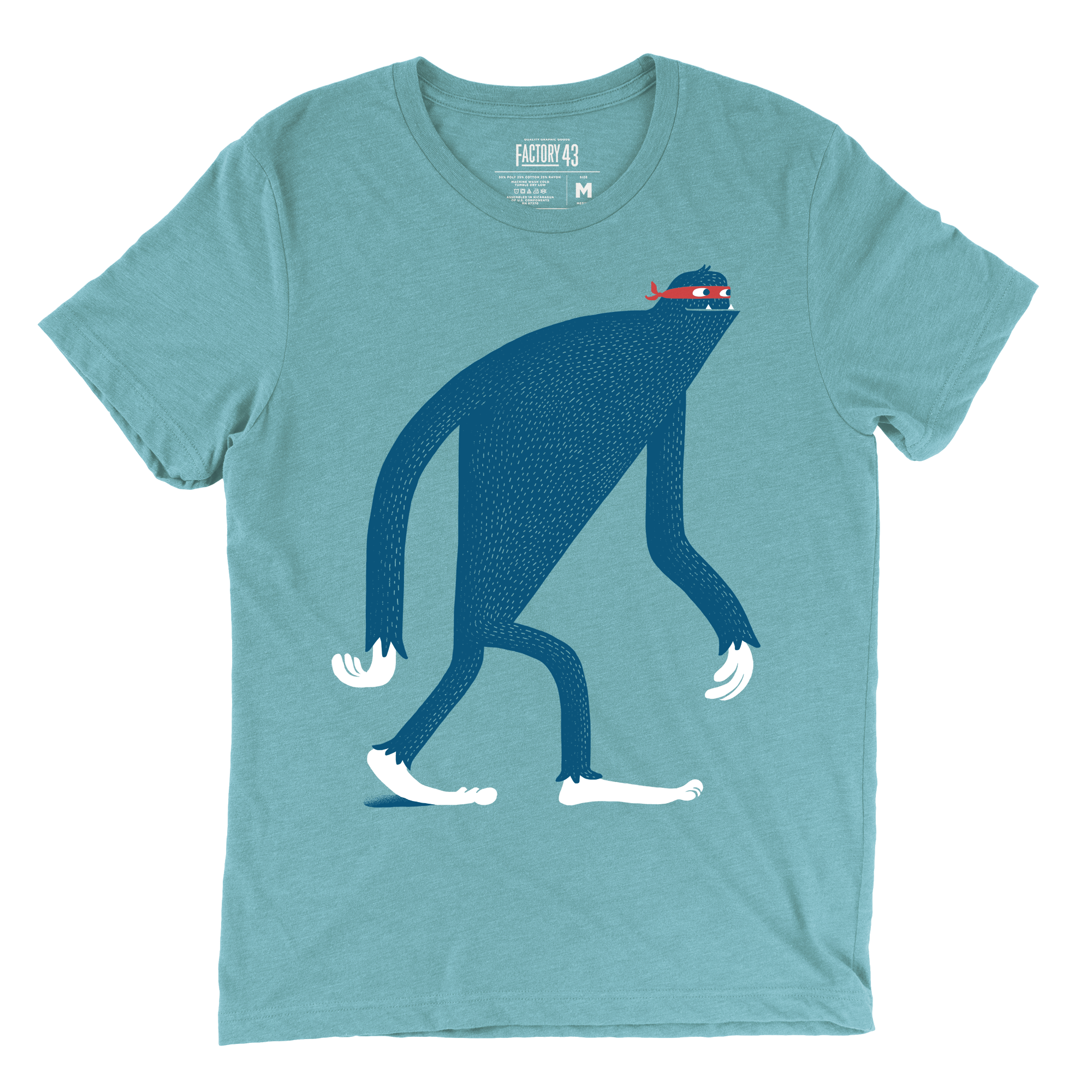 Soft cotton-poly tee in Heather Mustard and Blue Lagoon. Discharge print 52% combed and ring-spun cotton, 48% polyester blend