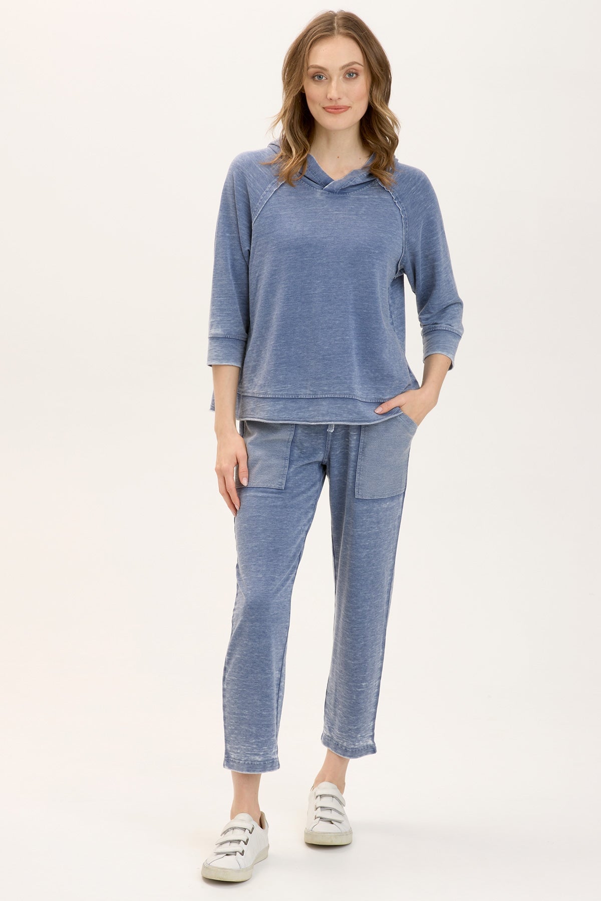 This lush burnout terry hoodie features 3/4 raglan sleeves, a hood, and a relaxed fit silhouette. Burnout Terry: 60/40 Cotton/Polyester. Center Front: ~20″ Center Back: ~23.5″ Color Description: Heathered navy blue Preshrunk Machine washable Imported MODEL Ashley is wearing size Small. Height: 5’9″ | Bust: 32B | Waist: 27″ | Hip: 37″