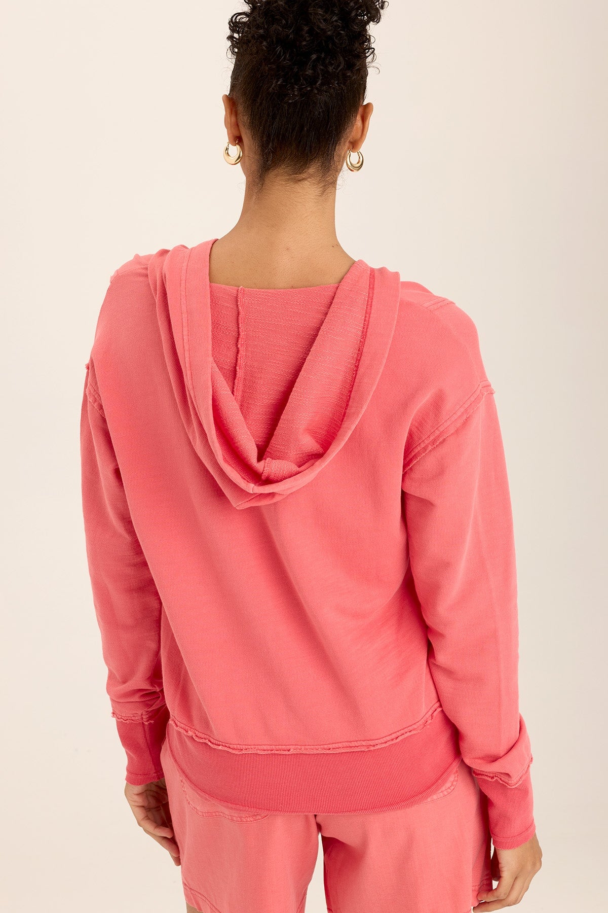 Raw edging details and exaggerated rib contrast has Rosalyn turning heads. With a traditional kangaroo pocket and slimming seaming, Rosalyn will be your favorite fashion sweatshirt. Slub Terry: 100% Cotton. 2×1 Rib Inserts: 96/4 Rayon/Spandex Center Front: ~21.5″ Center Back: ~23.5″ Color Description: Zesty coral pink Preshrunk Machine washable Imported MODEL August is wearing size XS Height: 5’9 | Bust: 36″ | Waist: 26″ | Hip: 37″