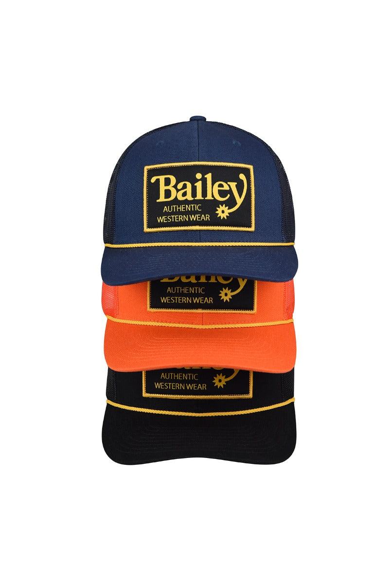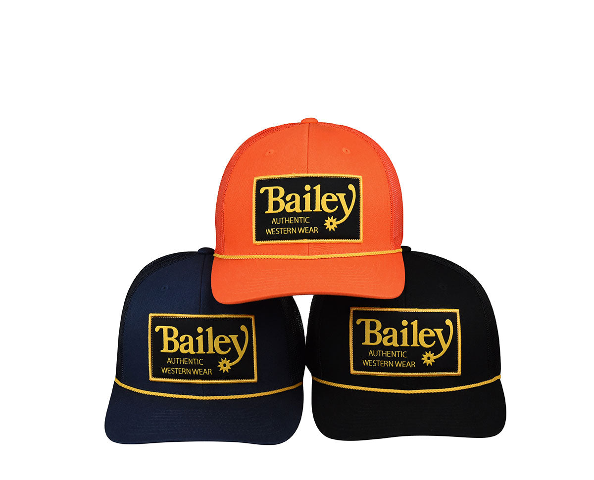 The Valor Trucker Cap by Bailey Western blends classic western craftsmanship with modern trucker style. Made from durable cotton twill with a breathable mesh back, this 6-panel cap offers a comfortable fit with a matching snap-back closure. The front showcases an oversized embroidered “Bailey Authentic Westernwear” patch, accented by a gold brim cord for a premium, standout finish. Key Features: Classic 6-panel cotton twill trucker cap with breathable mesh back Adjustable snap-back closure for a secure, customizable fit Oversized embroidered “Bailey Authentic Westernwear” front patch Gold brim cord detail for a distinctive western-inspired look