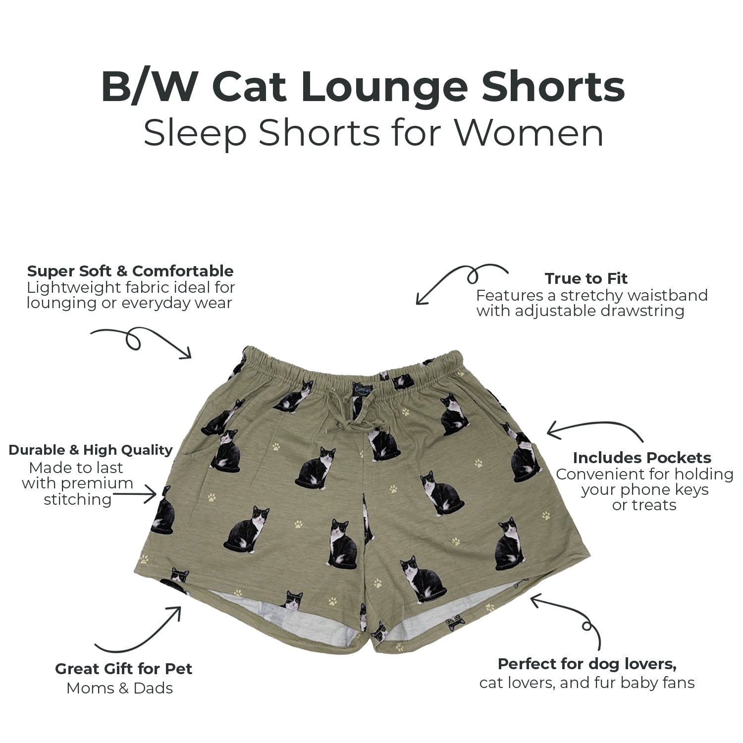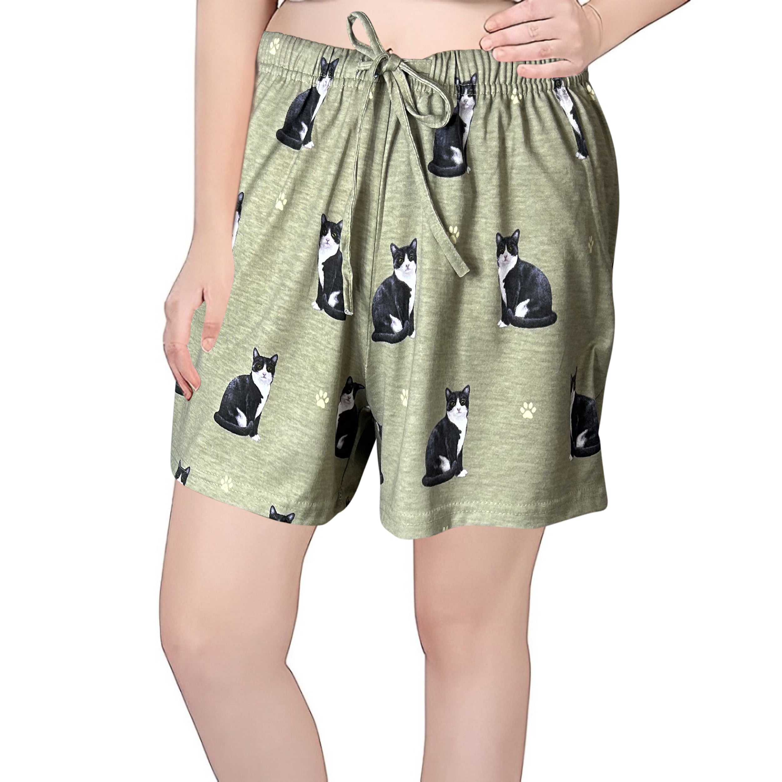Express your feline affection with these charming Womens Black and White Cat Print Lounge Shorts. Crafted from soft, breathable fabric, featuring an elastic waistband for all-day comfort, deep side pockets, and a cute cat motif, these shorts are a perfect blend of style and functionality. Whether youre relaxing at home, running errands, or enjoying a summer getaway, these shorts are an essential addition to your wardrobe. Treat yourself or a fellow pet enthusiast to these delightful shorts, ideal for various occasions like birthdays or Mothers Day. Shop now at PrimePetGifts.com, the ultimate destination for pet lovers.